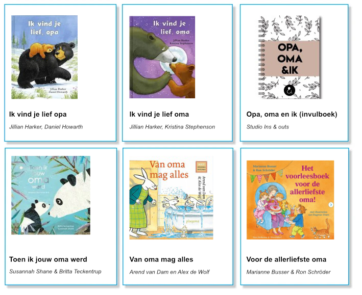 Voorlezen: kies leuke boeken uit, die je kunt bekijken. Er zijn ook verschillende boekjes over opa’s en oma’s. Laat de kinderen ook eens kiezen. (kijk bij voorlezen)